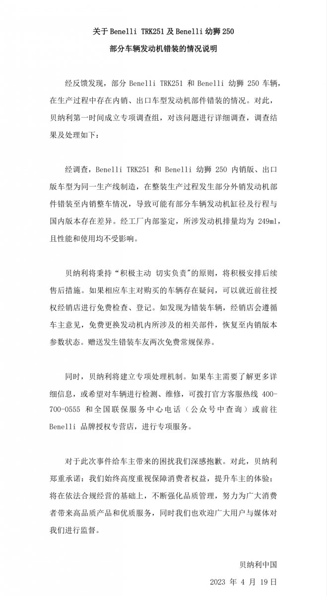 关于Benelli TRK251及Benelli幼狮250 部分车辆发动机错装的情况说明