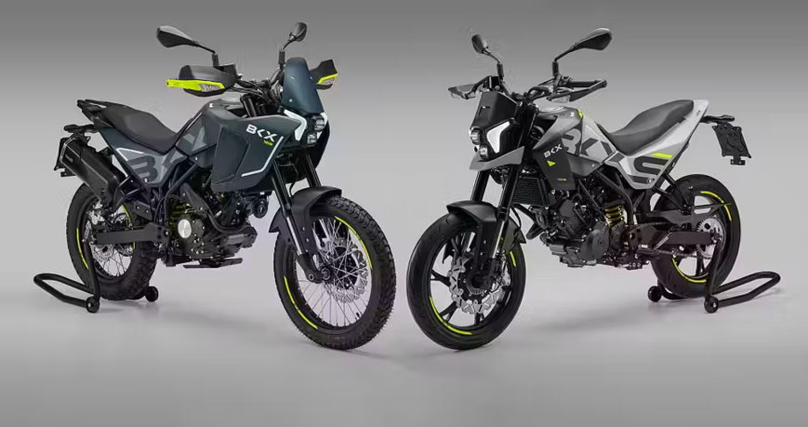 "Federwege und Räder als wesentliche Unterschiede- Wesentliche Unterschiede zwischen Benelli BKX 125 und BKX 125 S betreffen die Federwege und die Räder. Vorn und hinten jeweils 180 Millimeter Federweg stehen bei der Enduro BKX 125 zur Verfügung, bei der Supermoto BKX 125 S genügen jeweils 150 Millimeter. Konzeptgerecht rollt die BKX 125 auf Drahtspeichenrädern mit grobem Reifenprofil in den Formaten 90/90-19 vorn und 120/90-17 hinten, die BKX 125 S auf Aluminiumguss-Rädern mit Onroad-Bereifung in 100/80-17 vorn und 130/70-17 hinten."