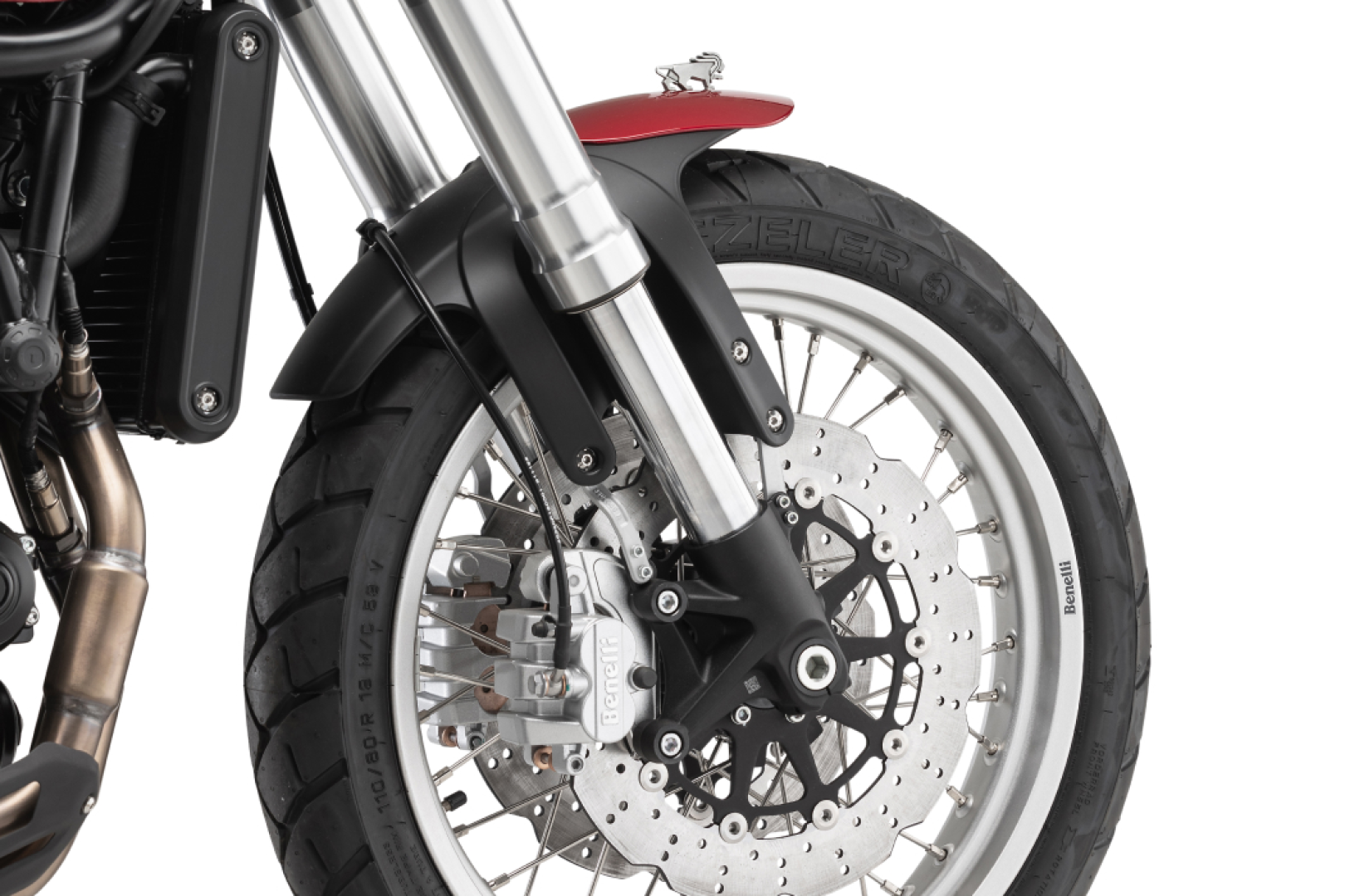 The round LED front light of the Leoncino 500 Trail, framed by a classic structure, is a perfect blend of tradition and modernity. The iconic Pesaro lion design on the front fender pays homage to Benelli's historic heritage.
