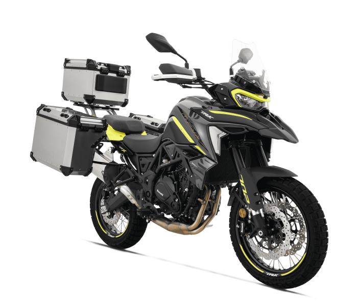 The Benelli TRK 702 X is an agile and versatile adventure bike, built for both on-road and off-road adventures. Powered by a 698cc parallel-twin engine producing 70 HP at 8000 rpm and 70 Nm of torque at 6000 rpm, it ensures a responsive ride. The bike features a 50 mm upside-down front fork and an adjustable rear monoshock for superior handling. Equipped with 19-inch front and 17-inch rear wheels and a 20-liter fuel tank, the TRK 702 X is designed for long journeys. The full LED lighting and 5-inch TFT display with Bluetooth connectivity add modern touches to this rugged machine.