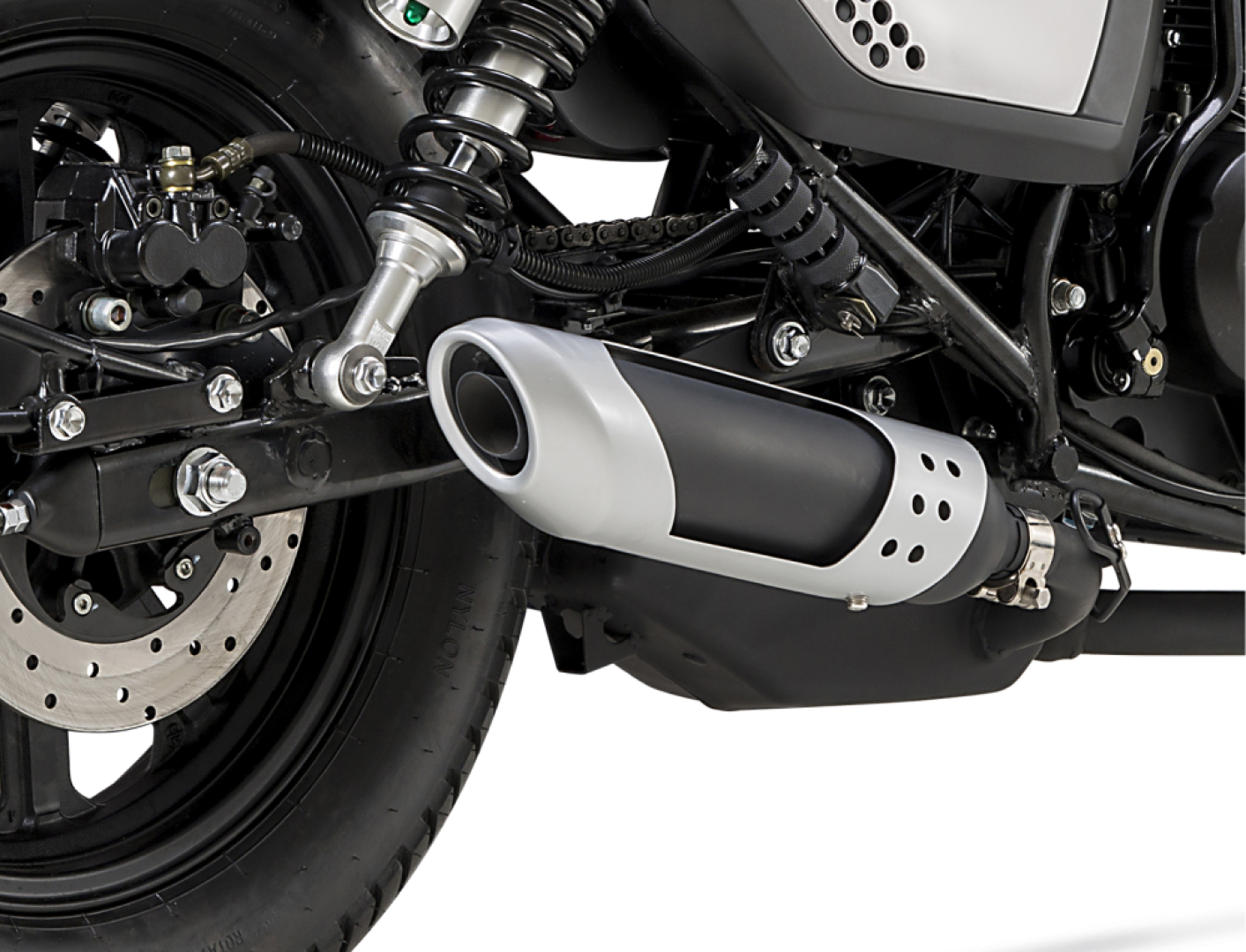 Knalpot klasik bergaya pembalap kafe berjalan di bagian bawah sasis dengan sudut yang sedikit terangkat dan pelindung panas perak.