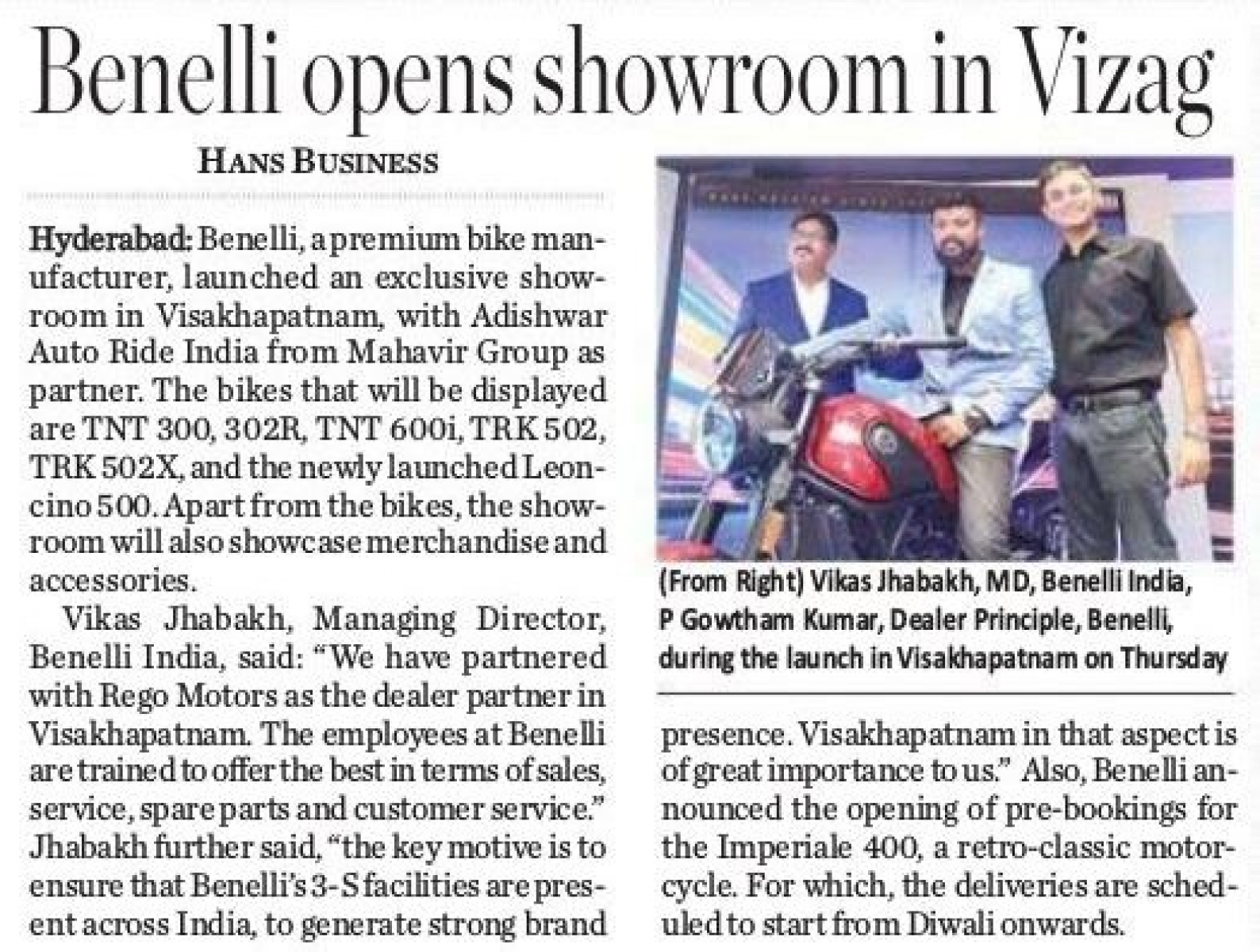 Benelli-Visakhapatnam is now ready to serve you with the adventure you have been waiting for! Benelli India proudly announces the grand opening of the Benelli Showroom in the Beautiful City of Destiny.
