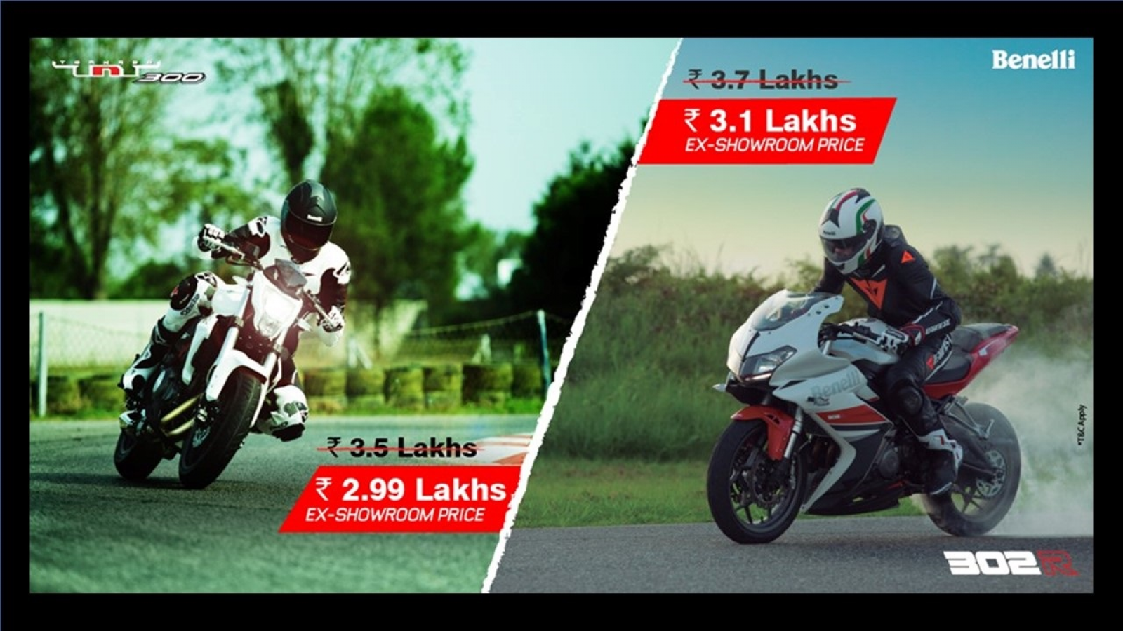 The Benelli TNT 300 and Benelli 302R gets affordable by Rs. 51,000 and Rs. 60,000 respectively.