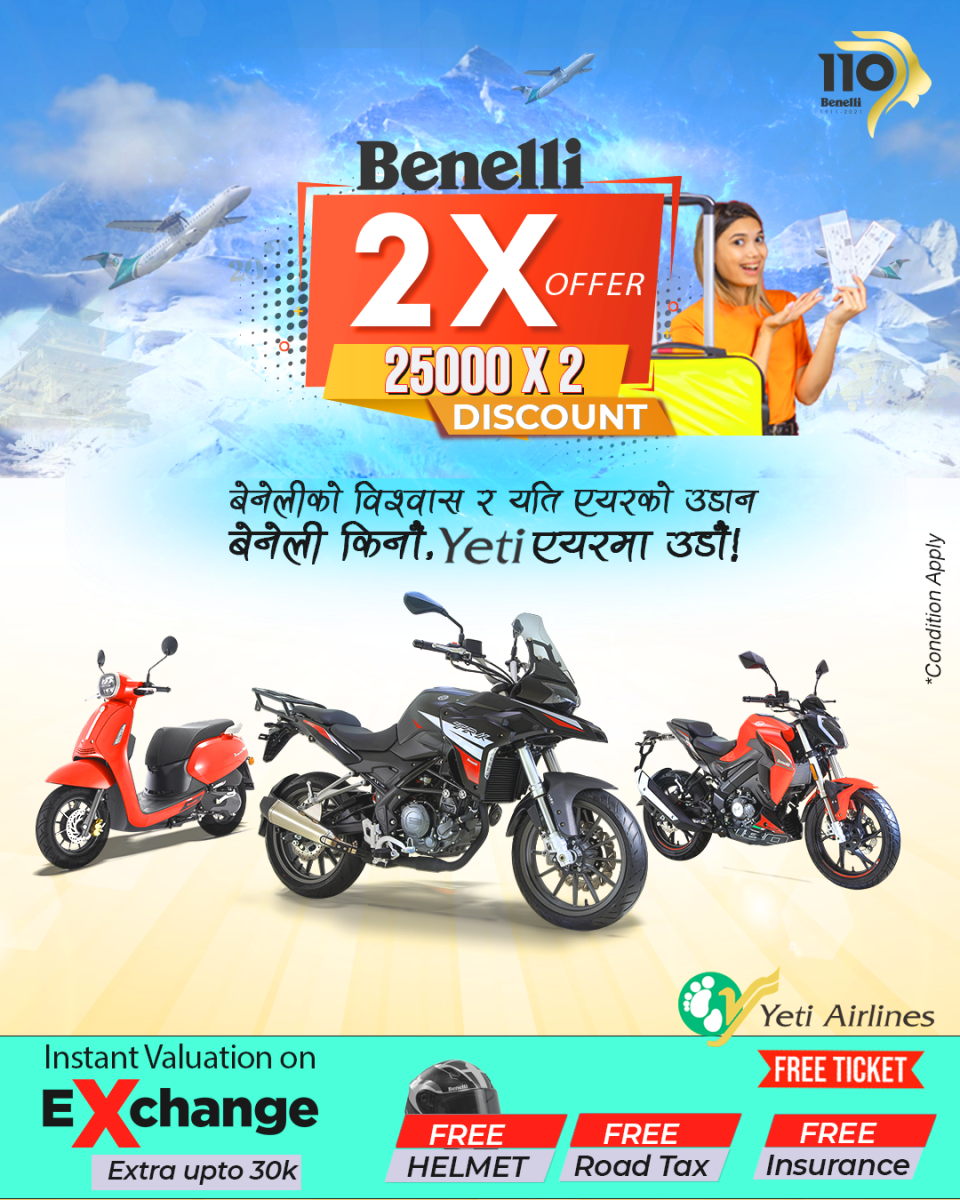 बेनेलीले नयाँ वर्ष २०२५ लाई शानदार बनाउँदै ग्राहकहरूको लागि विशेष अफर "२X डिस्काउन्ट अफर" सार्वजनिक गरेको छ। यस अफरअन्तर्गत ग्राहकहरूले बाइक खरिद गर्दा डबल फाइदा पाउनुहुनेछ। प्रत्येक बाइकमा २०२५ अफर अनुसार रु. ५०,००० सम्मको छूट, रोड ट्याक्स, प्रिमियम बेनेली हेलमेट र सम्पूर्ण इन्सुरेन्स नि:शुल्क प्रदान गरिनेछ। साथै, पुराना बाइक एक्सचेन्ज गर्दा बजार मूल्यभन्दा थप रु. ३०,००० को मूल्याङ्कन गरिनेछ। यसबाहेक, ग्राहकहरूले नेपाली कुनै पनि गन्तव्यमा यात्रा गर्न मिल्ने यति एयरलाइन्सको दुईतर्फी टिकट पनि प्राप्त गर्नुहुनेछ।