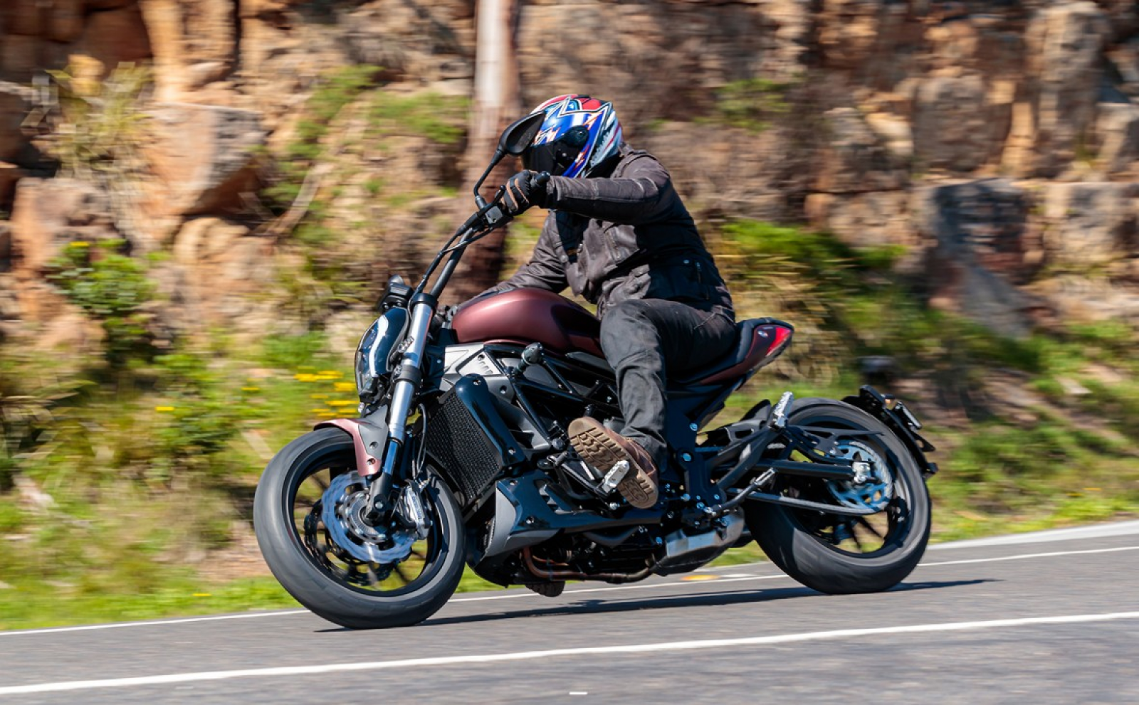 That skinny 160-section rear tyre makes tip-in a cinch as the bike builds up to some decent lean angles. The pegs are the first items to hit the deck, but that’s only at a decent clip.
