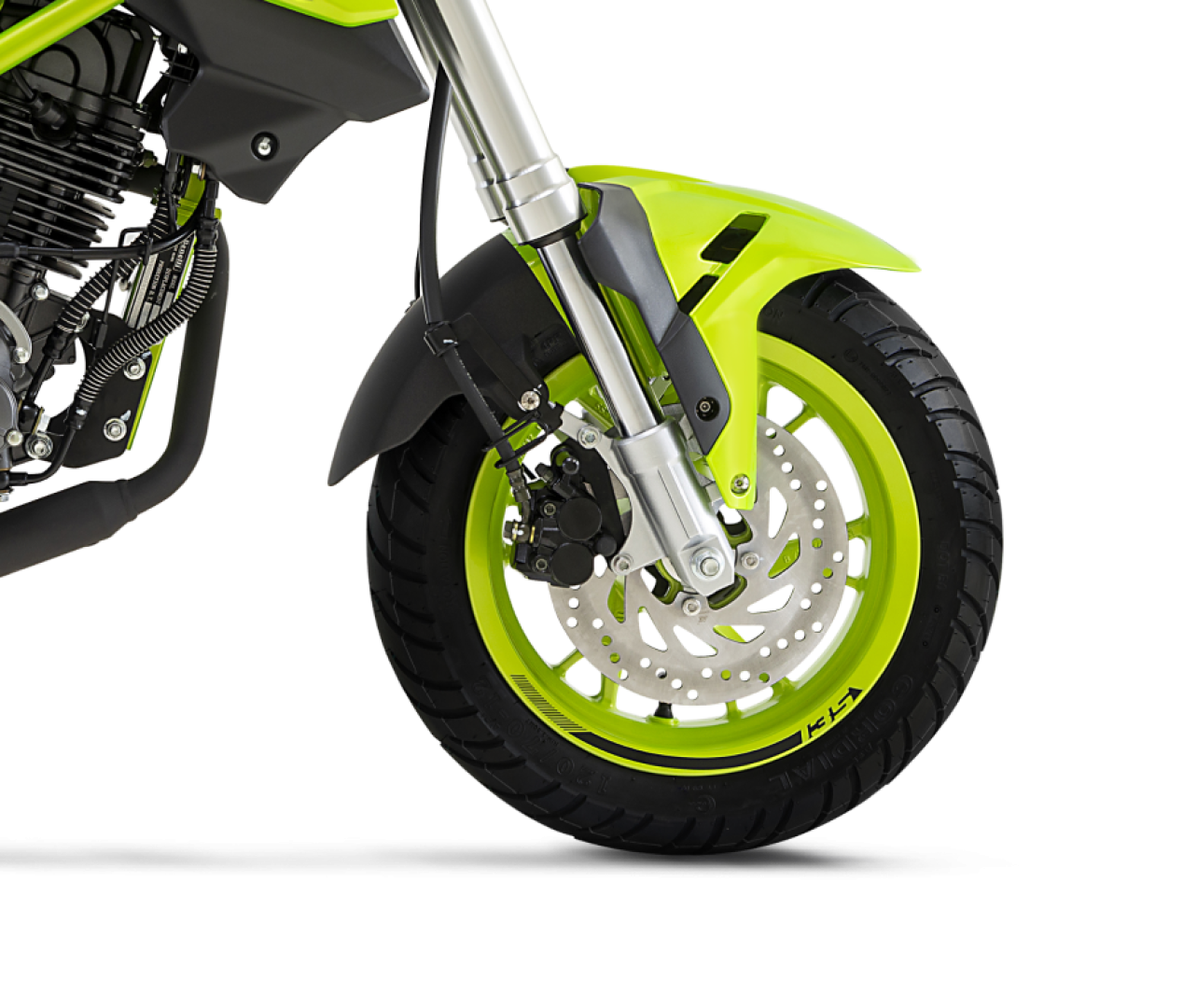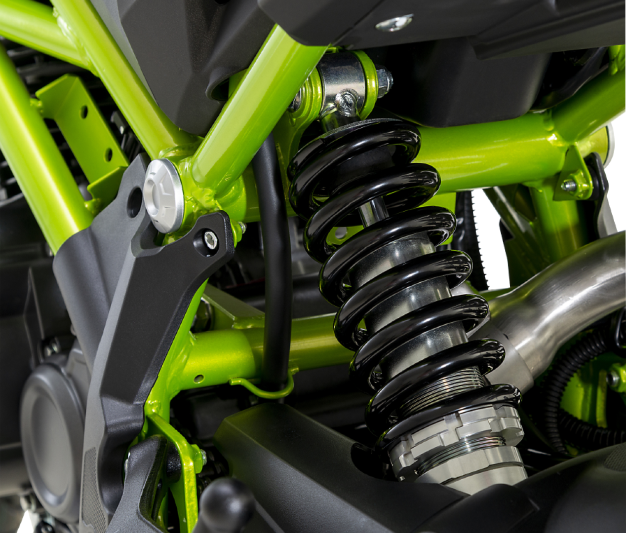Adjustable single shock design for a comfortable ride and stable performance. A beefy 41mm inverted fork and single-shock rear suspension system – along with 12-inch wheels fitted with fat, sticky tires – ensure the tiny TnT handles rough roads easily.