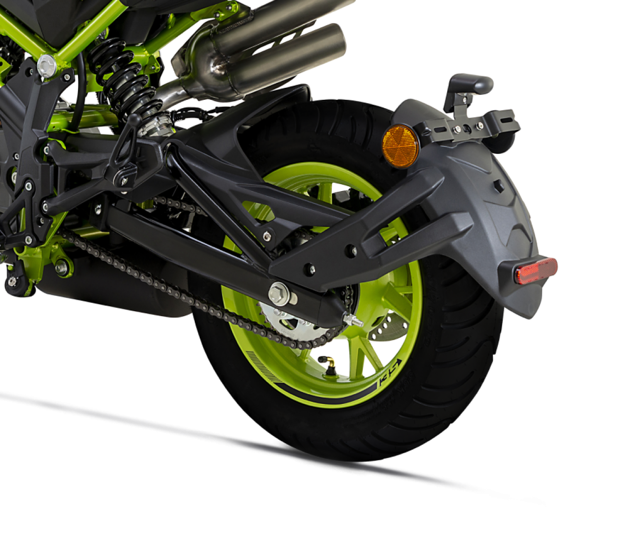 The streetfighter-design riding on small diameter 12-inch wheels makes for a machine that can blaze through even the tightest of urban environments.