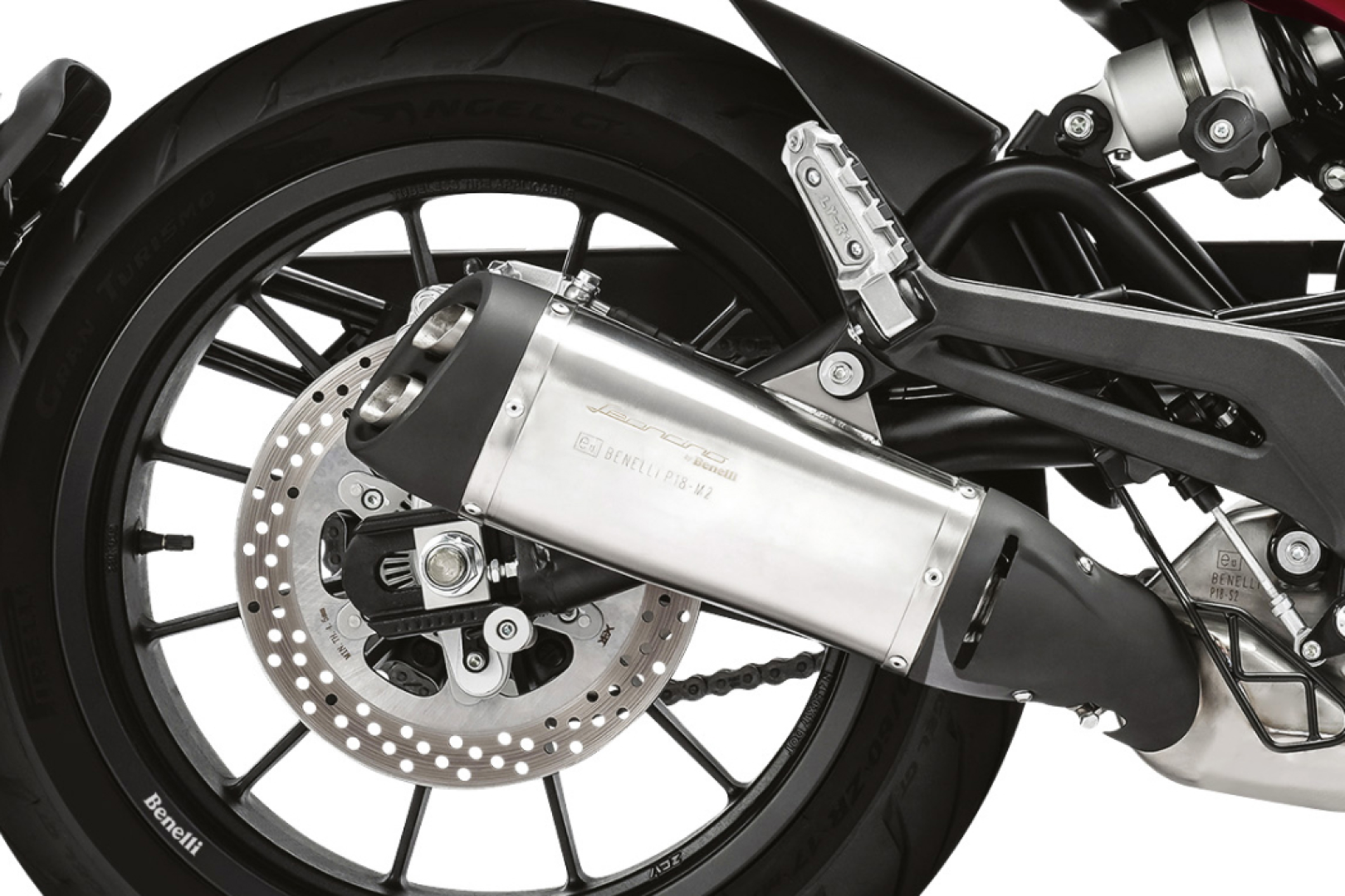 The exhaust system of the Leoncino 500 is designed to deliver optimal performance and an elegant appearance. The stainless steel exhaust is positioned to enhance the bike's balance and aesthetics, ensuring a smooth and powerful ride while maintaining a stylish look.