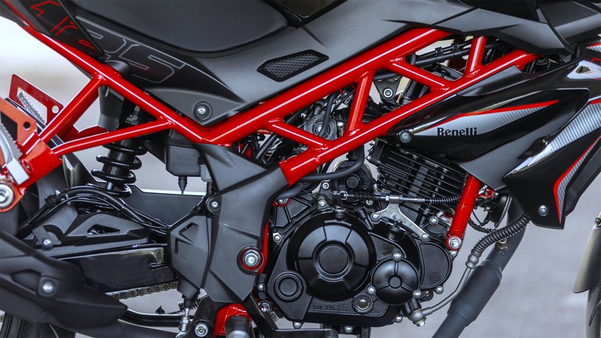 O quadro em treliça de aço garante estabilidade e maneabilidade, enquanto o sistema de suspensão — composto por uma forquilha invertida de 35 mm e um amortecedor traseiro com pré-carga ajustável — assegura conforto e controlo em todas as situações. O sistema de travagem, com disco dianteiro de 260 mm e disco traseiro de 240 mm, é gerido pelo sistema CBS, proporcionando uma travagem progressiva e segura. As jantes de liga leve de 17”, equipadas com pneus 110/80 à frente e 130/70 atrás, oferecem excelente agilidade e aderência, tanto em meio urbano como em estrada aberta.